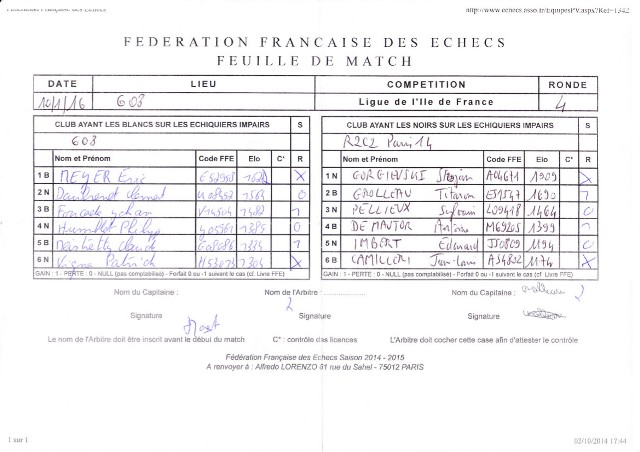 Nous jouions ce dimanche contre le Club 608. Sur leur territoire, puisque cette journée s'est déroulée à l'hôpital Saint Louis. Titouan et Antoine ont gagné chacun leur partie, tandis que Jean-Louis et Stojan faisaient match nul contre leur adversaire. Avec les défaites de Sylvain (qui ne pouvait rien faire dans sa situation) et Edouard, la journée s'est soldée par un match nul...